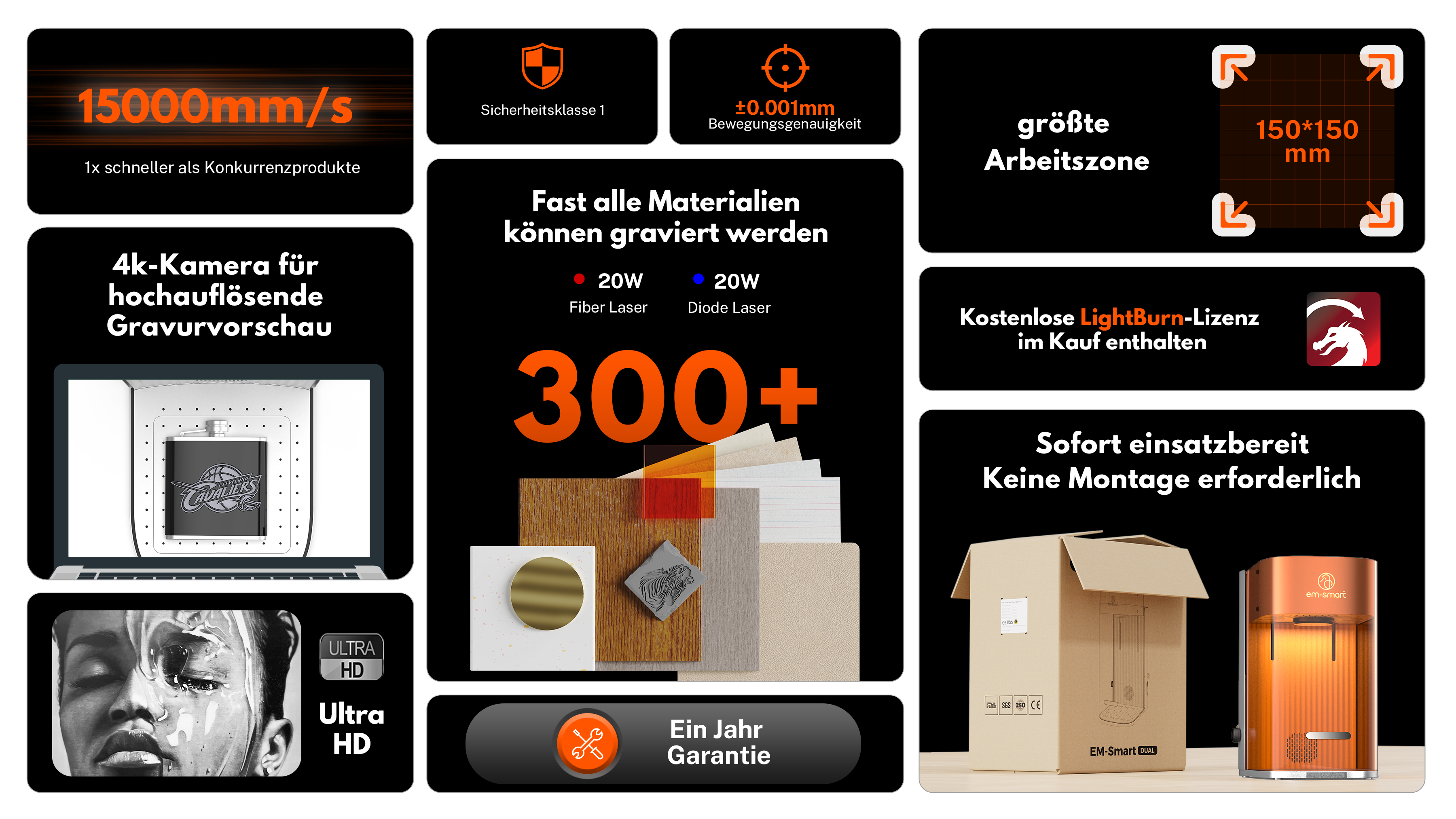 Ausgestattet mit einem Not-Aus-Schalter für sofortiges Abschalten sowie professionellen Laserschutzbrillen für vollständigen Anwenderschutz.