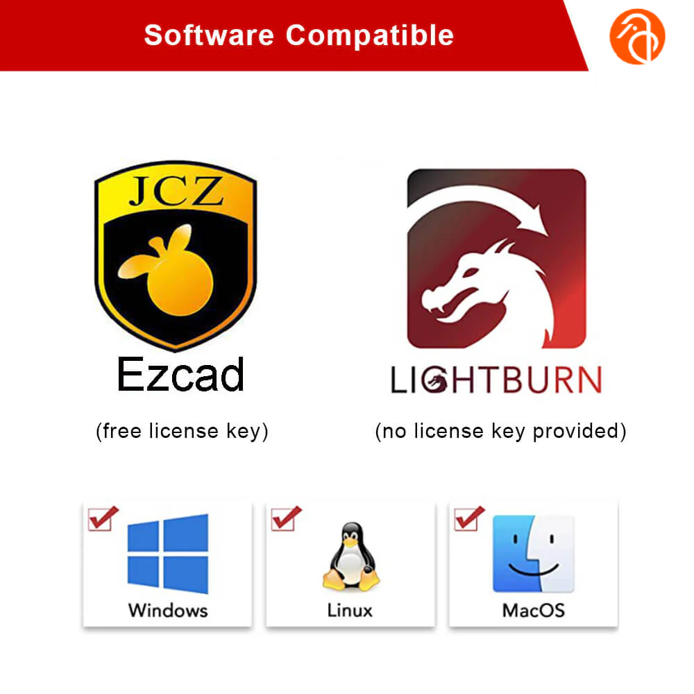 Alle EM-Smart-Laser werden mit einer angepassten BJJCZ-Lasermarkierungsplatte geliefert. Sie sind sowohl mit Ezcad als auch mit LightBurn kompatibel, um alle Ideen zu entfachen, und Sie können Ihren EM-Smart unter Windows, MAC und Linux verwenden.