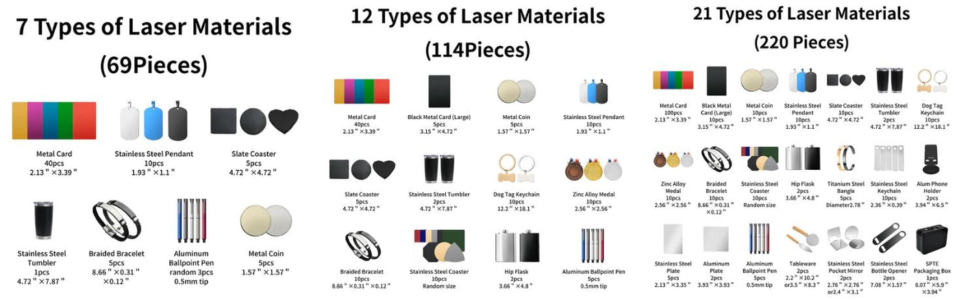 This versatile material kit includes a wide range of items to inspire your creativity: metal cards, stainless steel, aluminum, brass, leather tags, leather bags, wooden boards, wooden and metal coasters, metal bookmarks, medals, metal and leather card holders, brass rings, bracelets, and even a brass stamp.