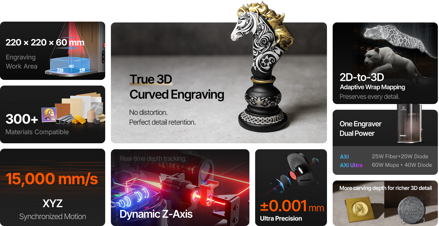 Das hochpräzise optische Fokussiersystem des AXI ermöglicht eine Wiederholgenauigkeit von ±0,001 mm – für messerscharfe Details und konstant perfekte Ergebnisse.