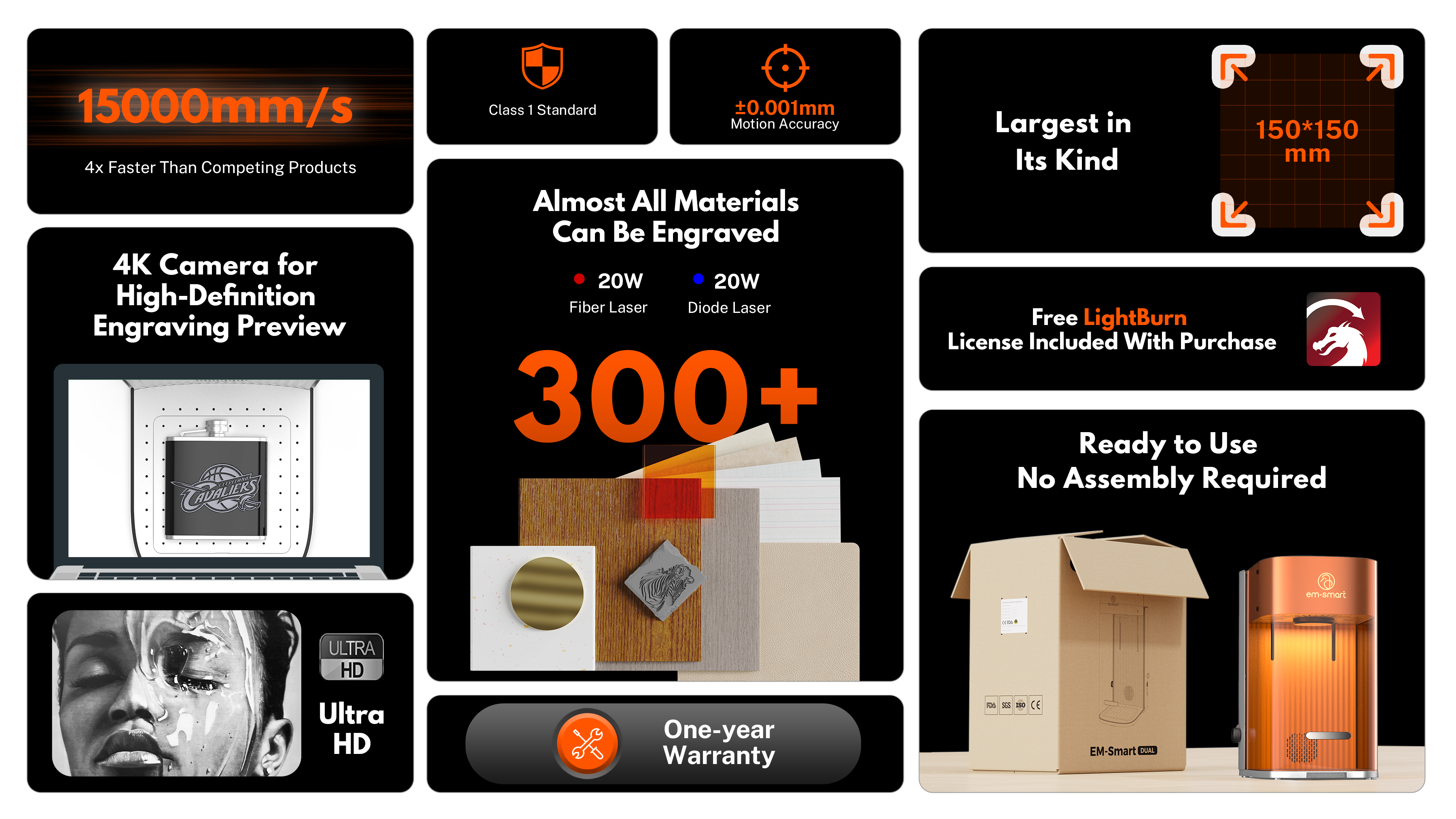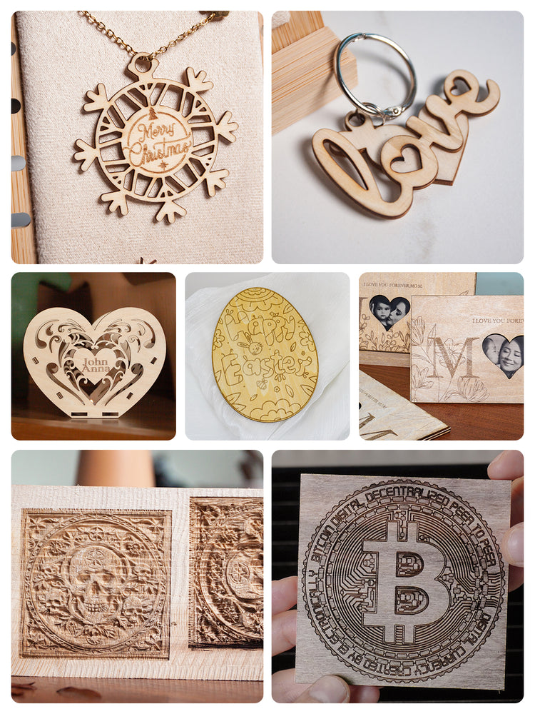 - Cutting: Powerfully cuts materials like 25mm wood and 15mm acrylic, and engraves on surfaces including 1mm metal (using a coating).
